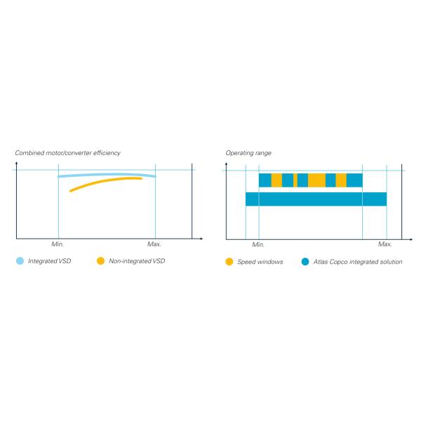 • Integrated Elektronikon Graphic controller controls the motor speed and high efficiency frequency inverter.